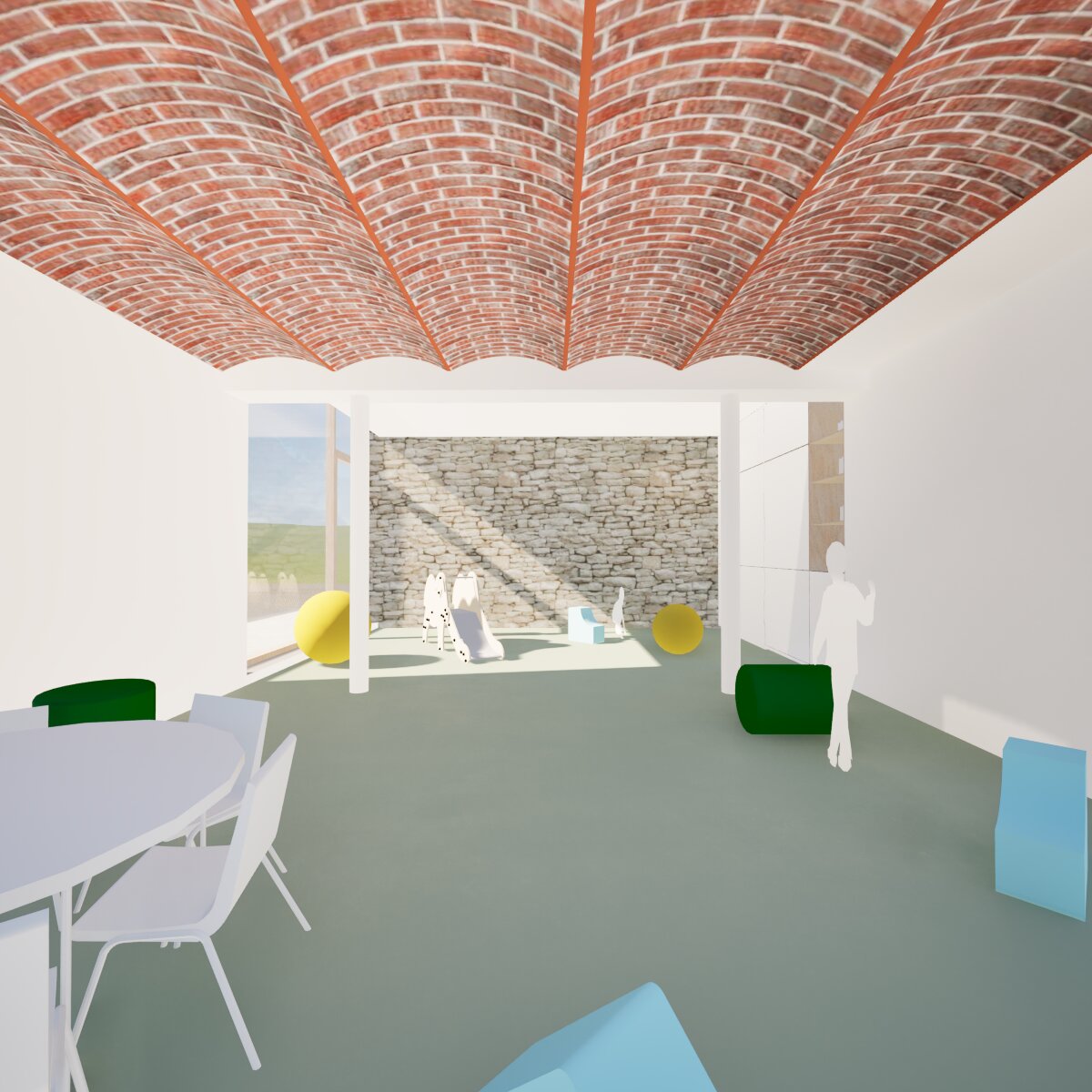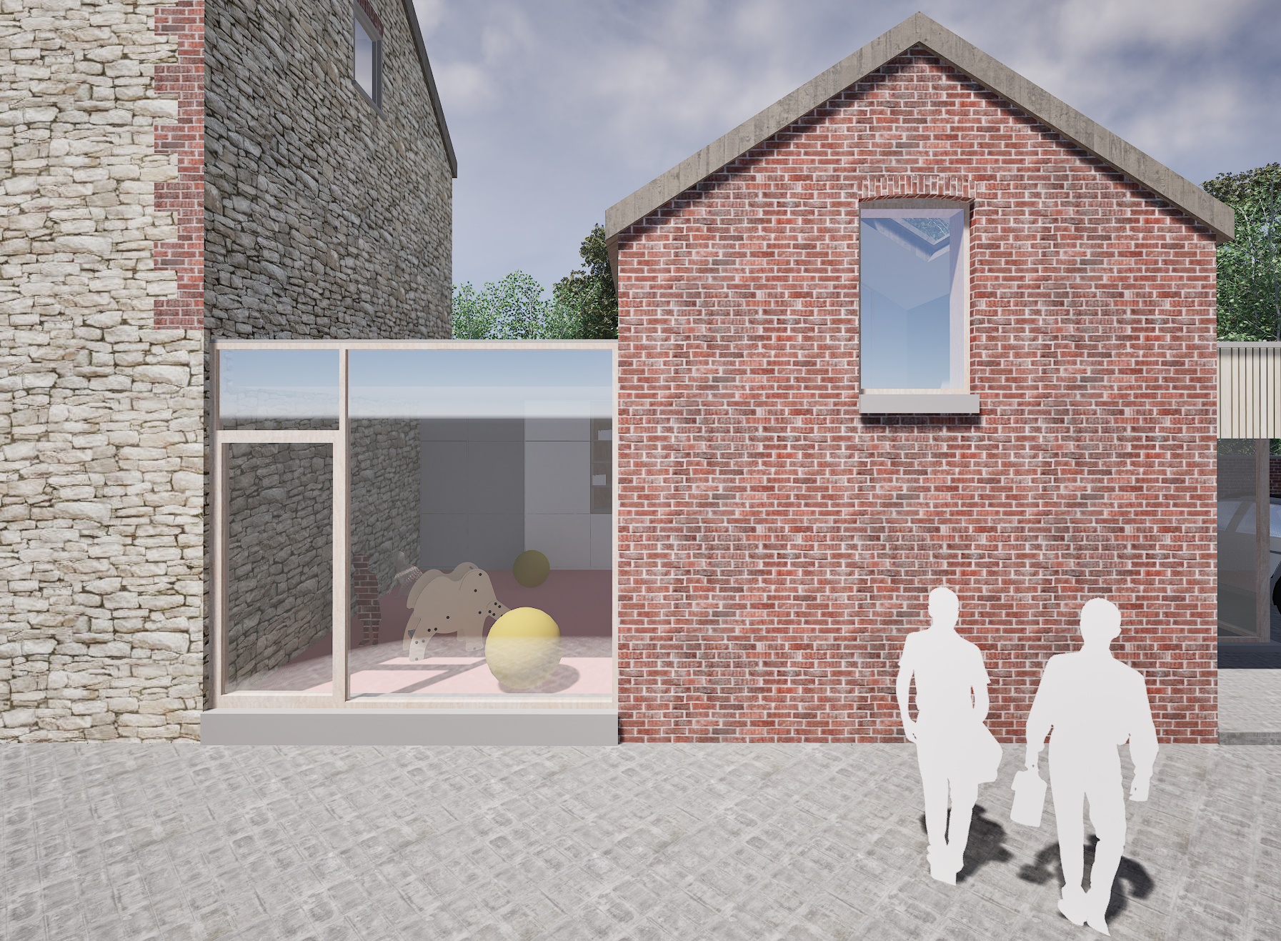 L’ensemble des espaces nécessaires à cette activité s’implante dans la grange existante et dans l’extension projetée entre cette dernière et l’habitation.