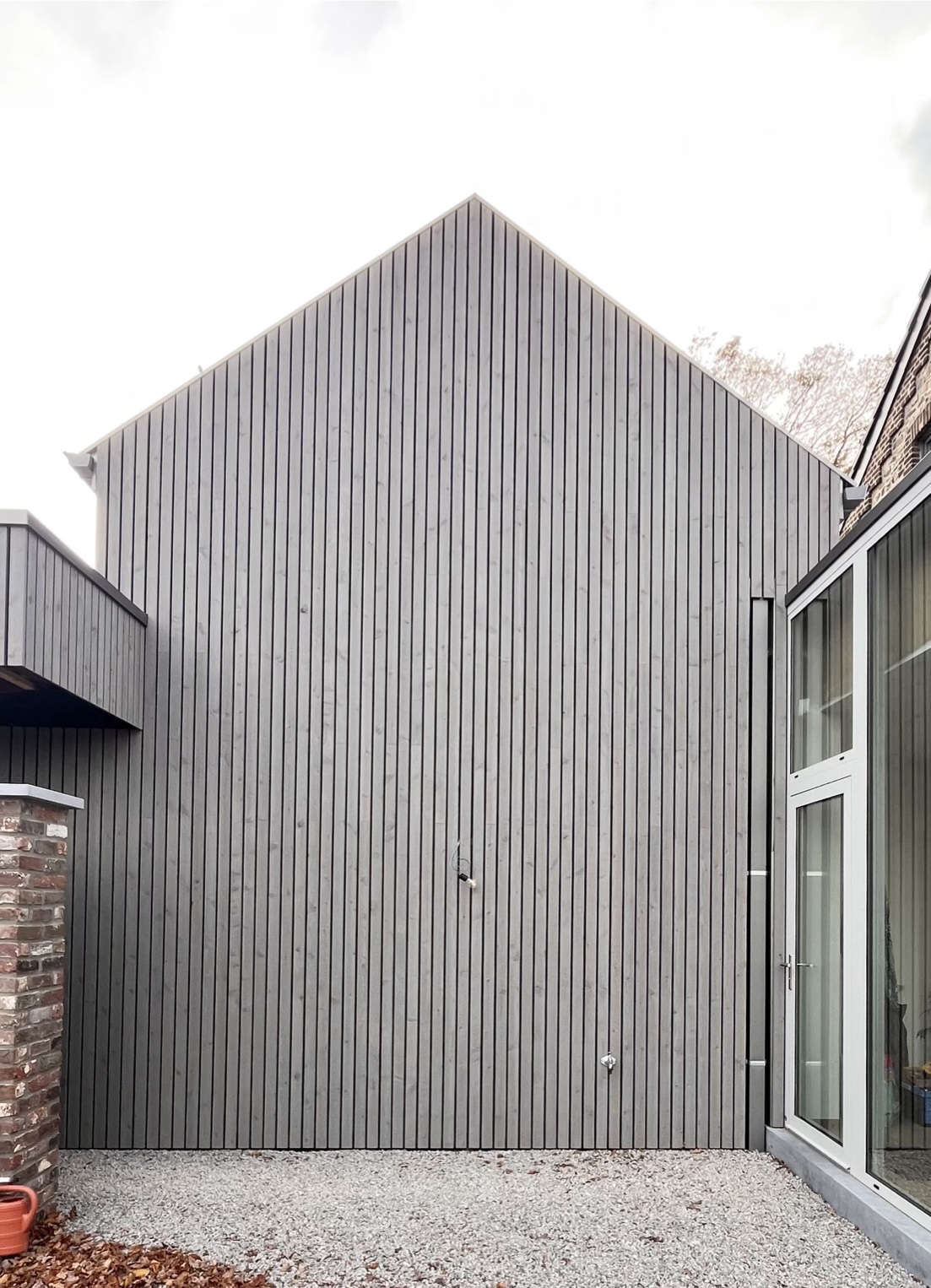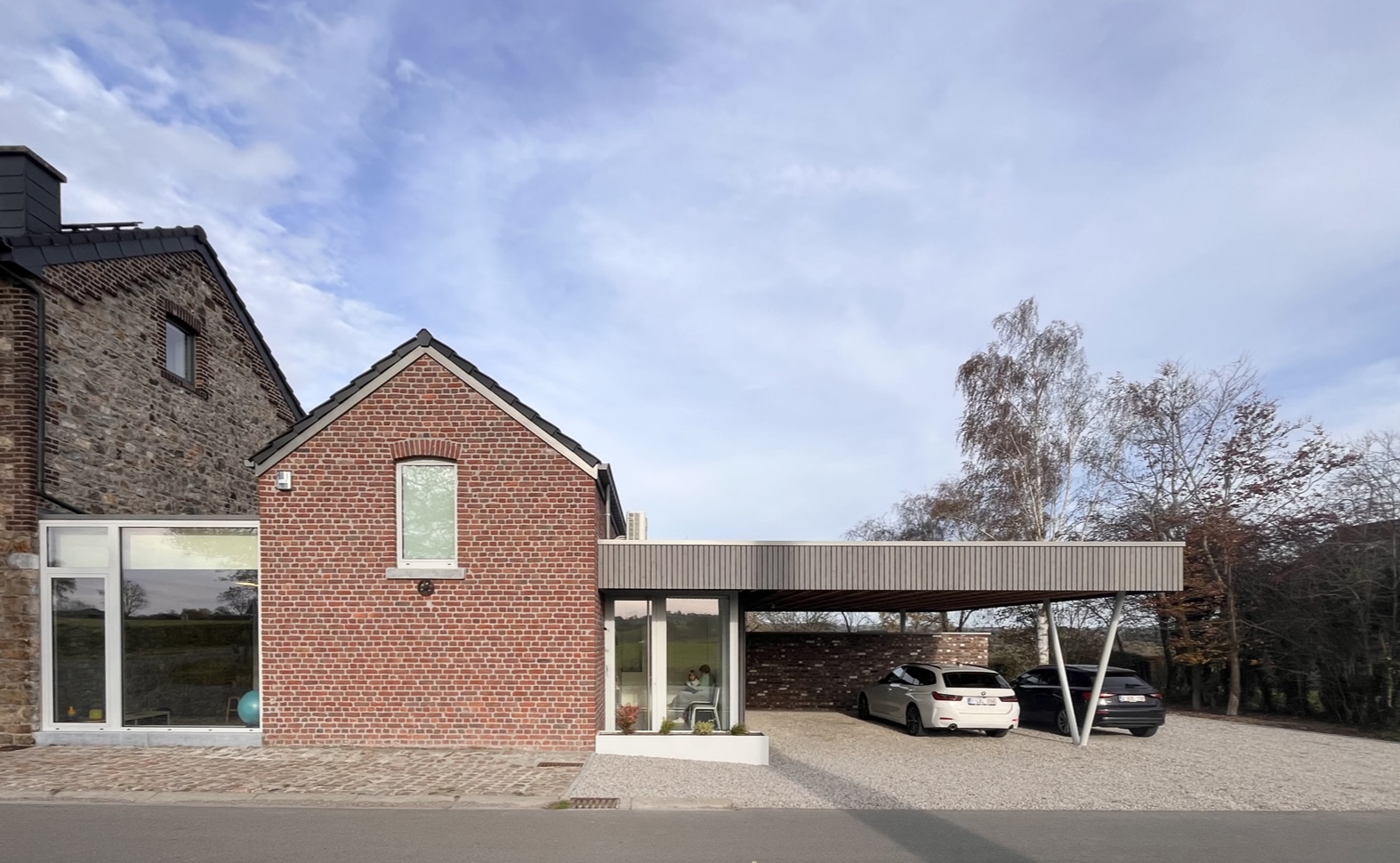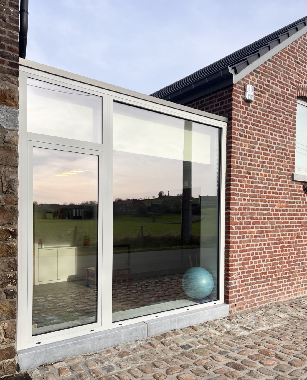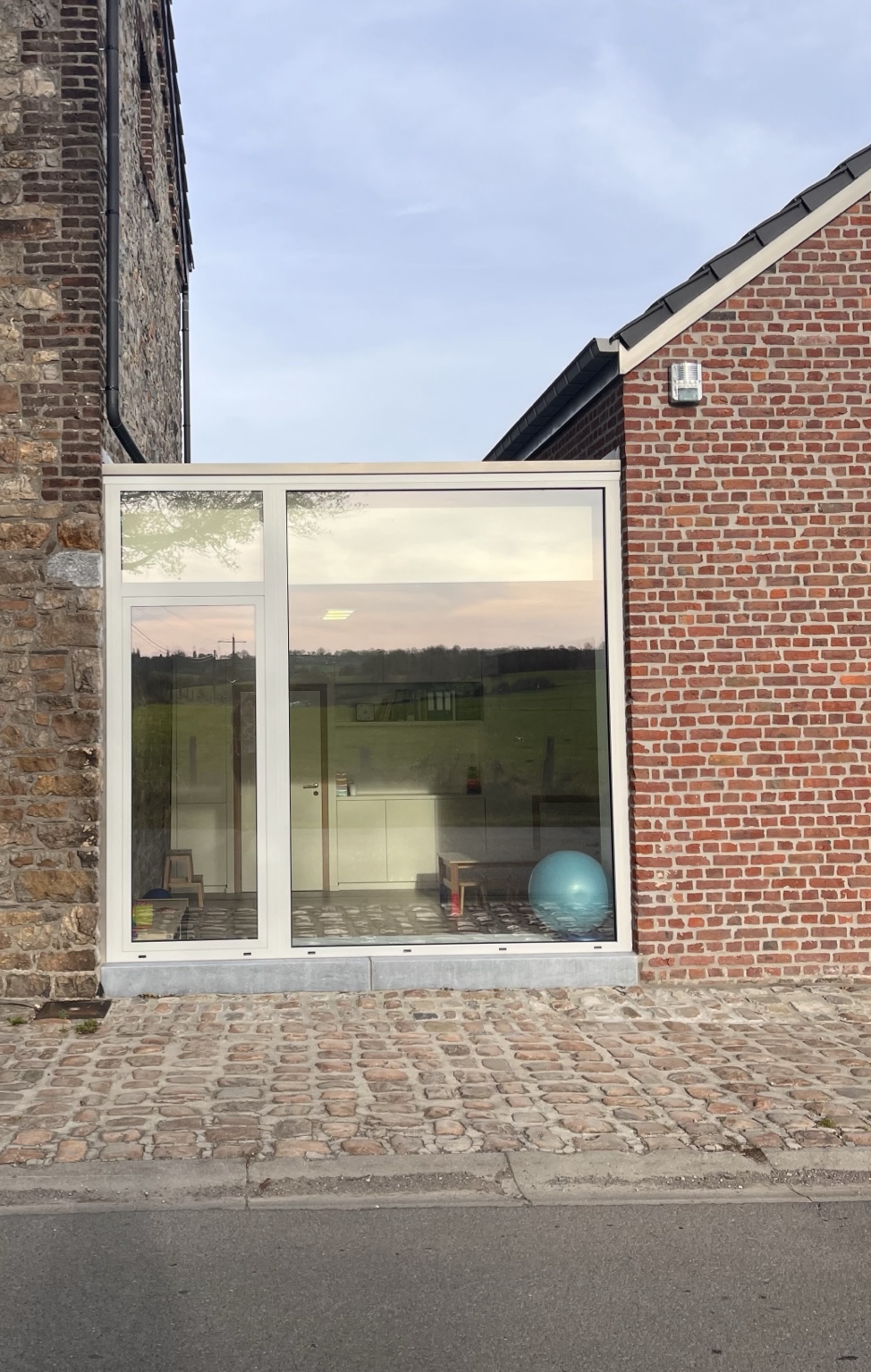 Une grande baie vitrée relie les deux bâtiments en façade avant, offrant une vue dégagée sur le paysage champêtre et un bel apport de lumière naturelle dans l’espace de psychomotricité.