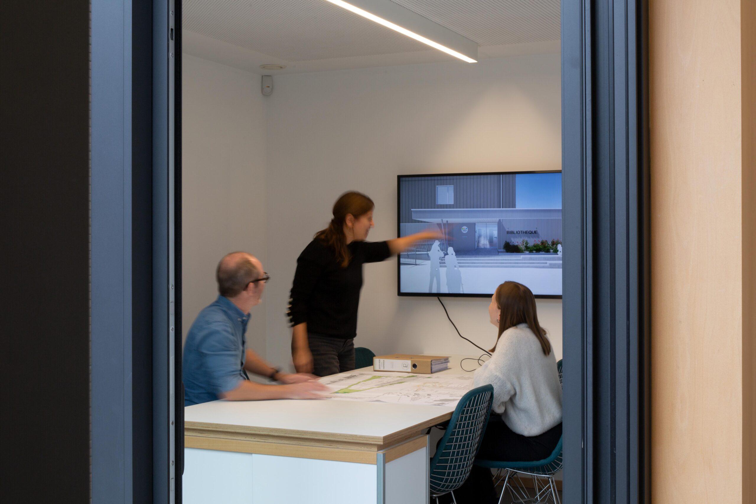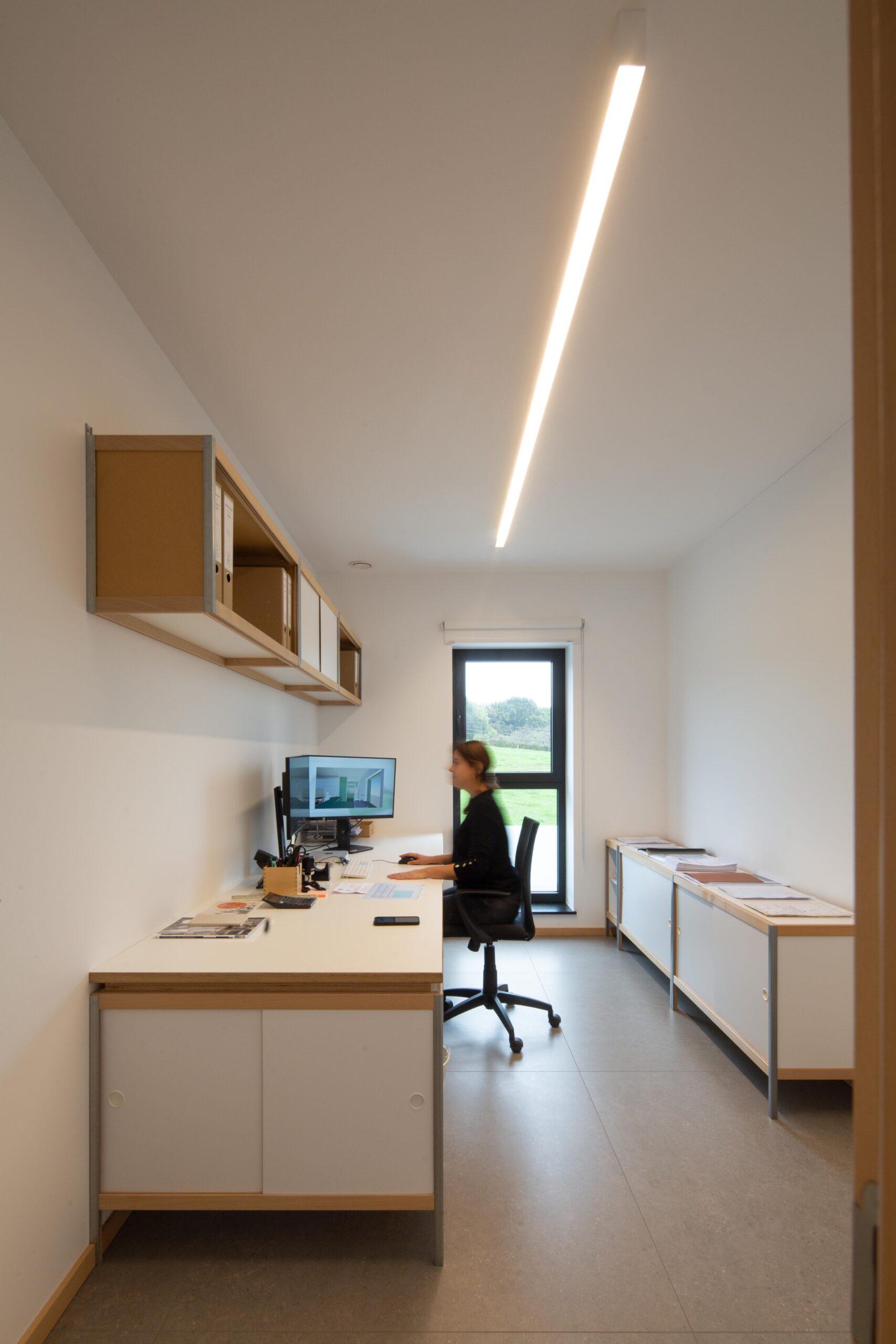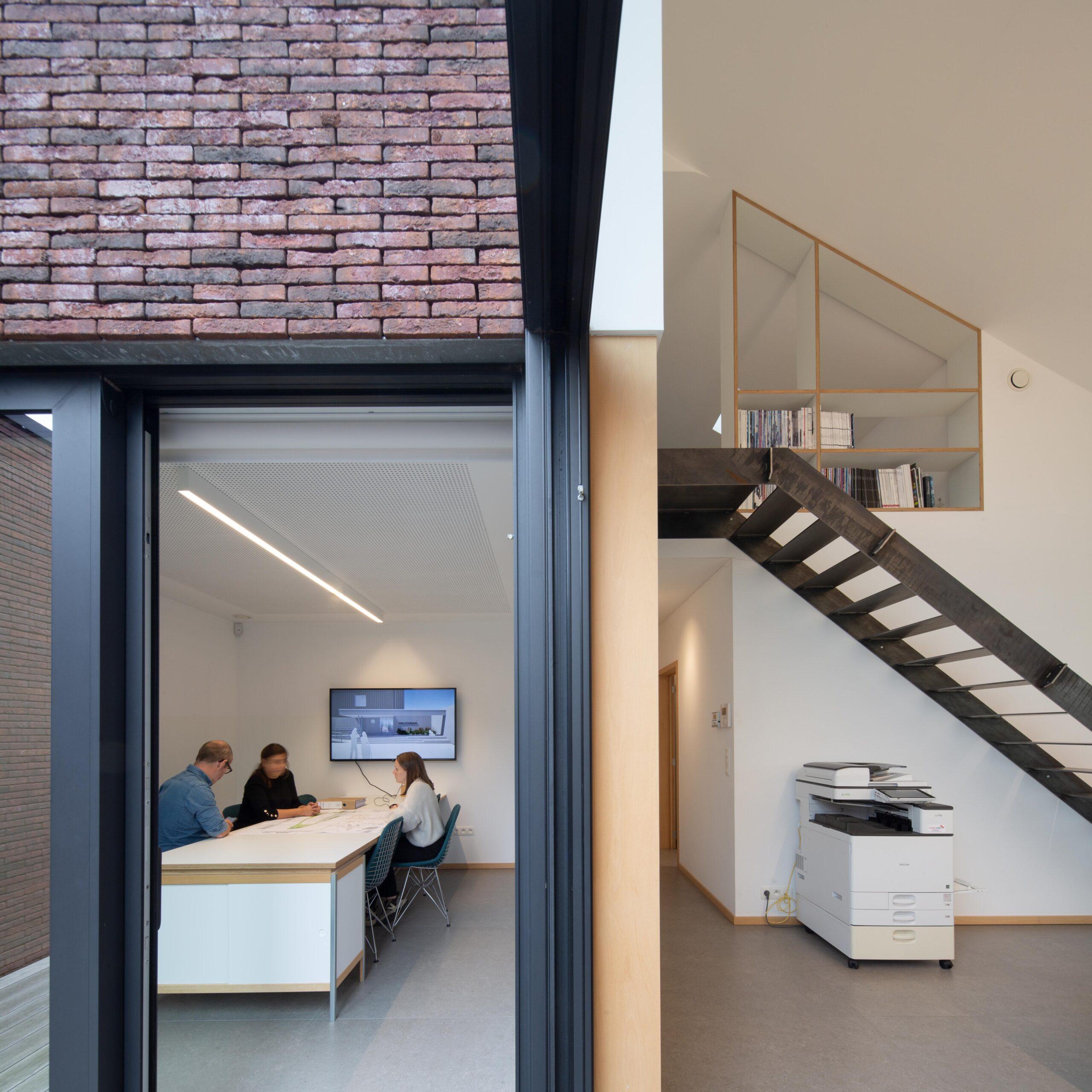 Ce nouvel espace bureaux a été imaginé pour accueillir notre atelier d'architecture dans un cadre lumineux. Chaque espace a sa propre identité et utilité : open space, salle de réunion, bureaux, ... Des connexions visuelles sont imaginées entre l'open space et la salle de réunion grâce aux larges baies vitrées qui bordent la terrasse centrale favorisant transparence et échanges. La toiture à un versant offre une belle hauteur à l'open space et permet l'implantation d'une mezzanine qui pourrait devenir un espace de travail supplémentaire. L'intérieur se veut sobre, brut et fonctionnel, mettant en valeur les volumes, la lumière et les matières.