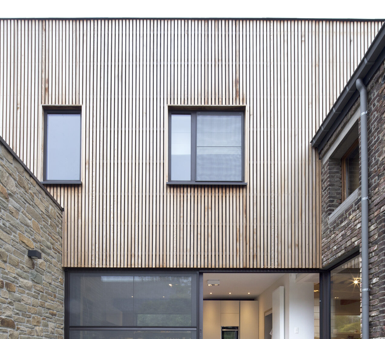 Cette nouvelle extension s'insère de manière cohérente dans le paysage existant avec son soubassement en moellons de la région. Le volume supérieur, plus aérien, est bardé de bois et apporte un certain contraste avec la brique de l'habitation existante.