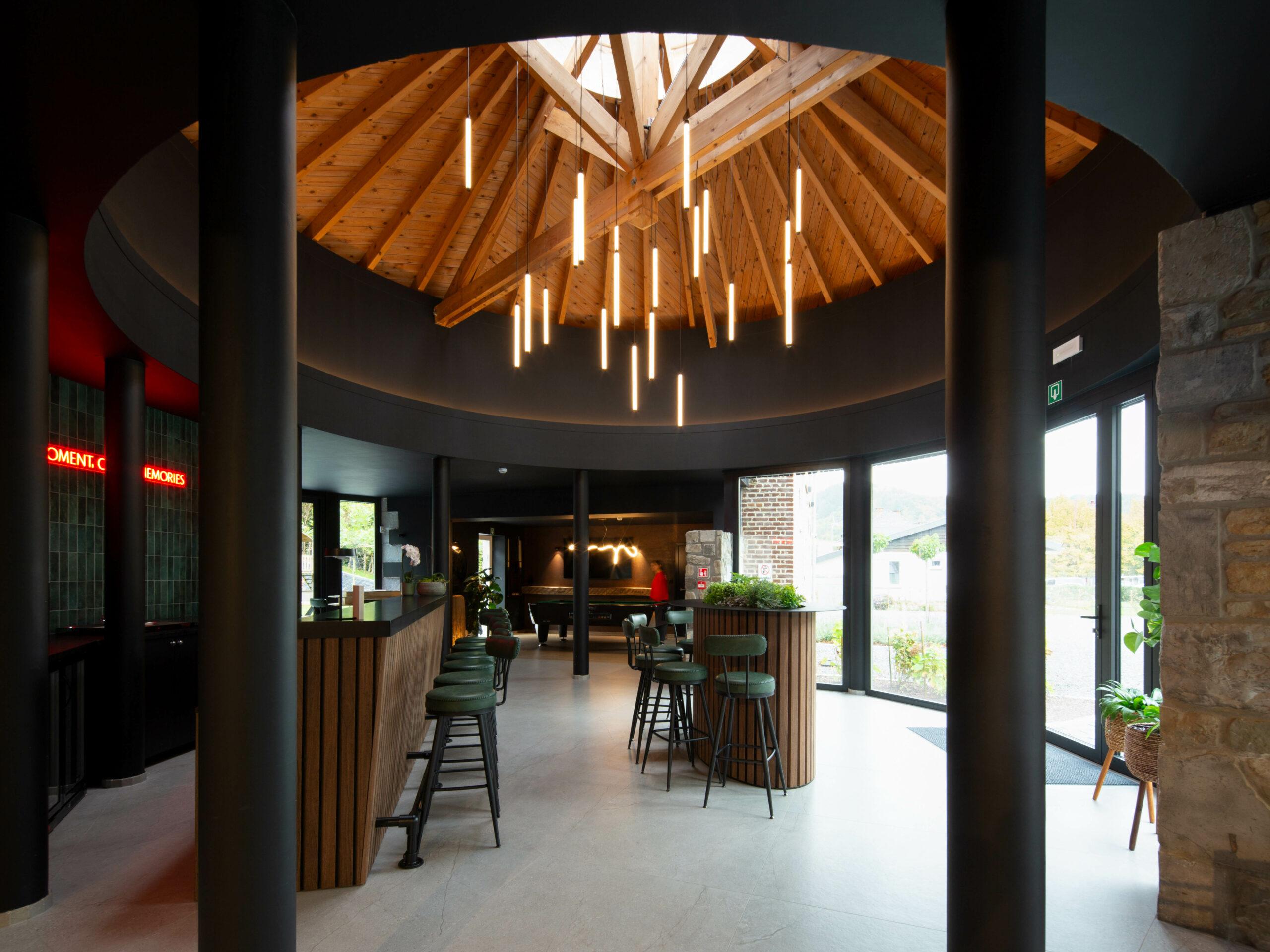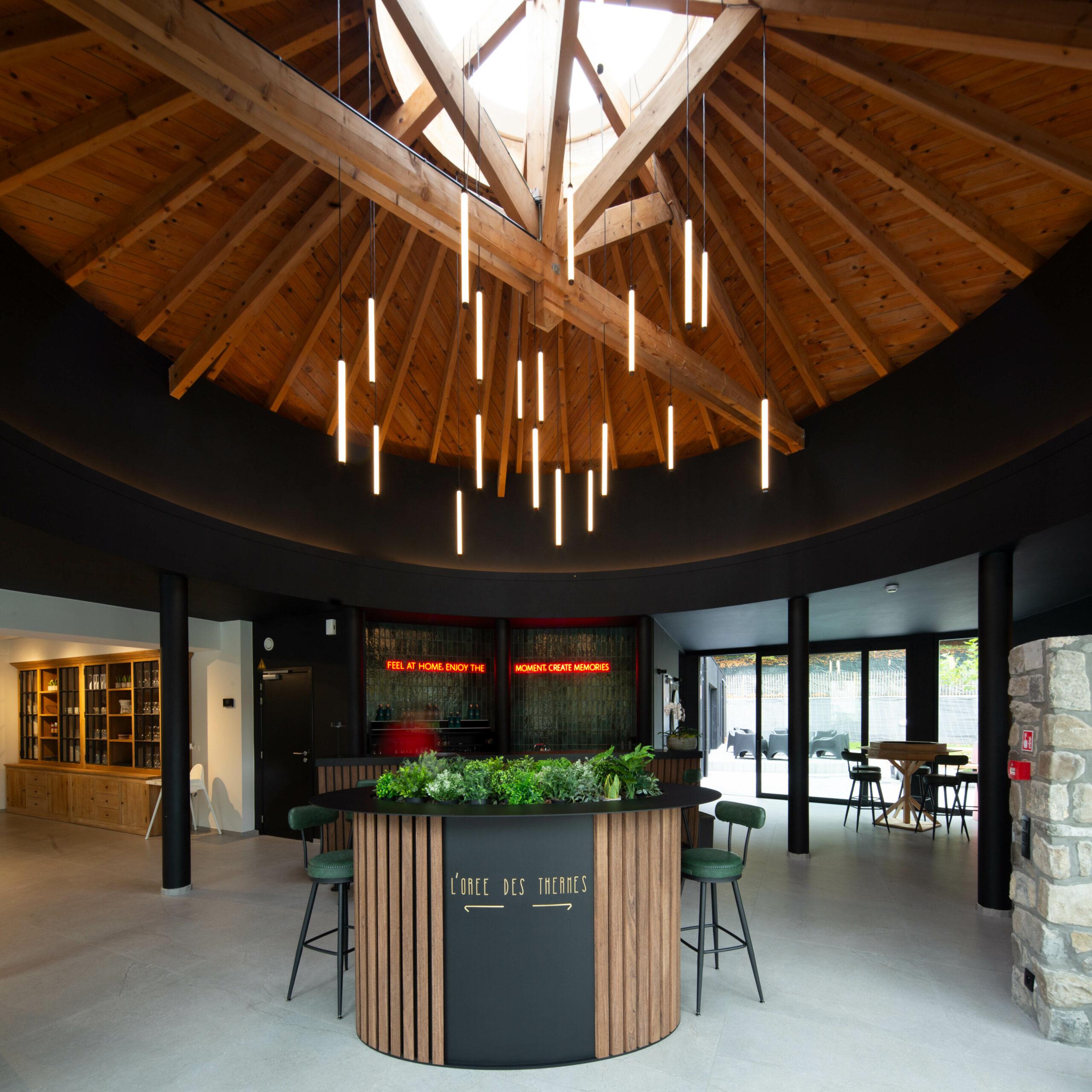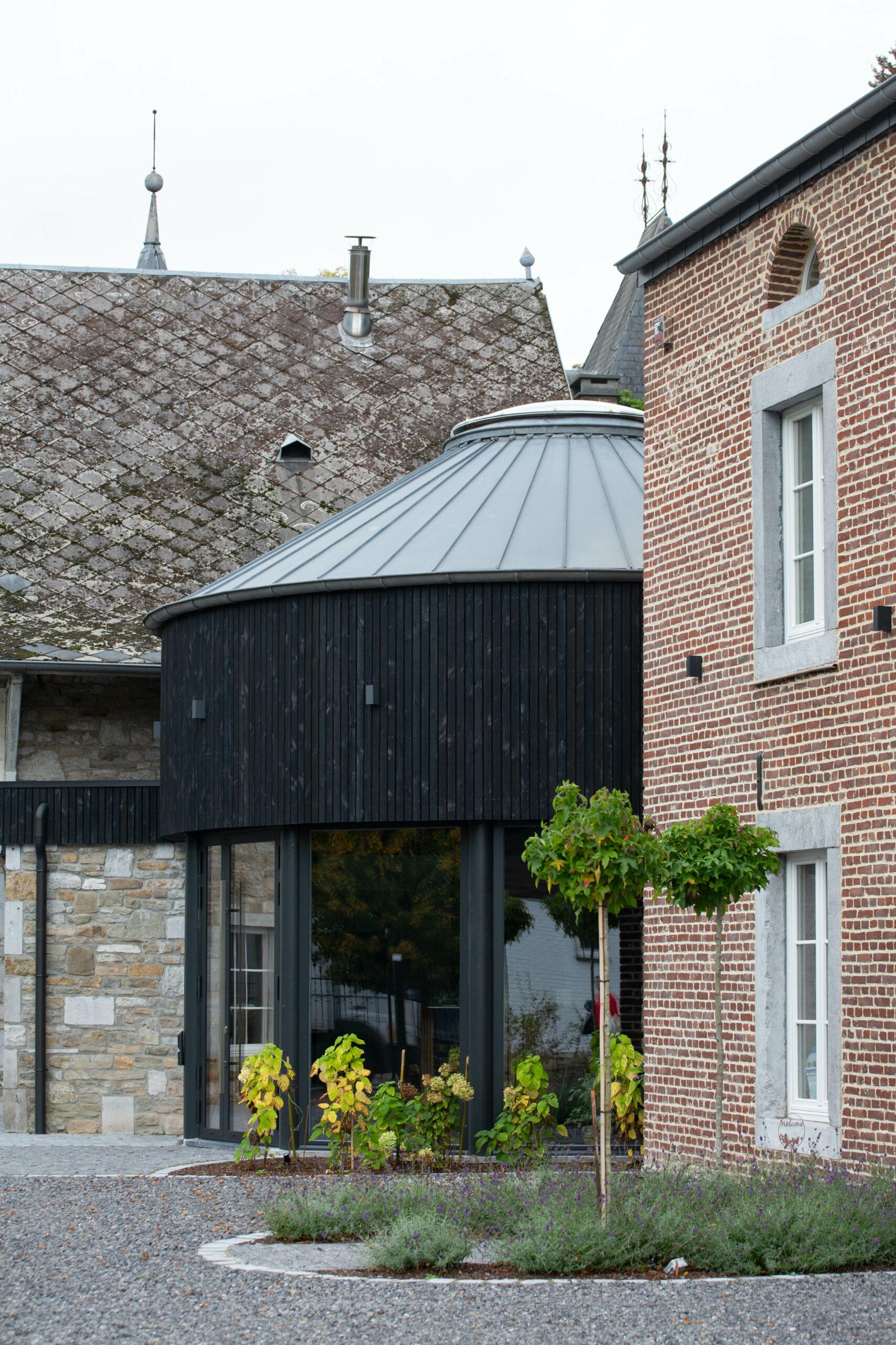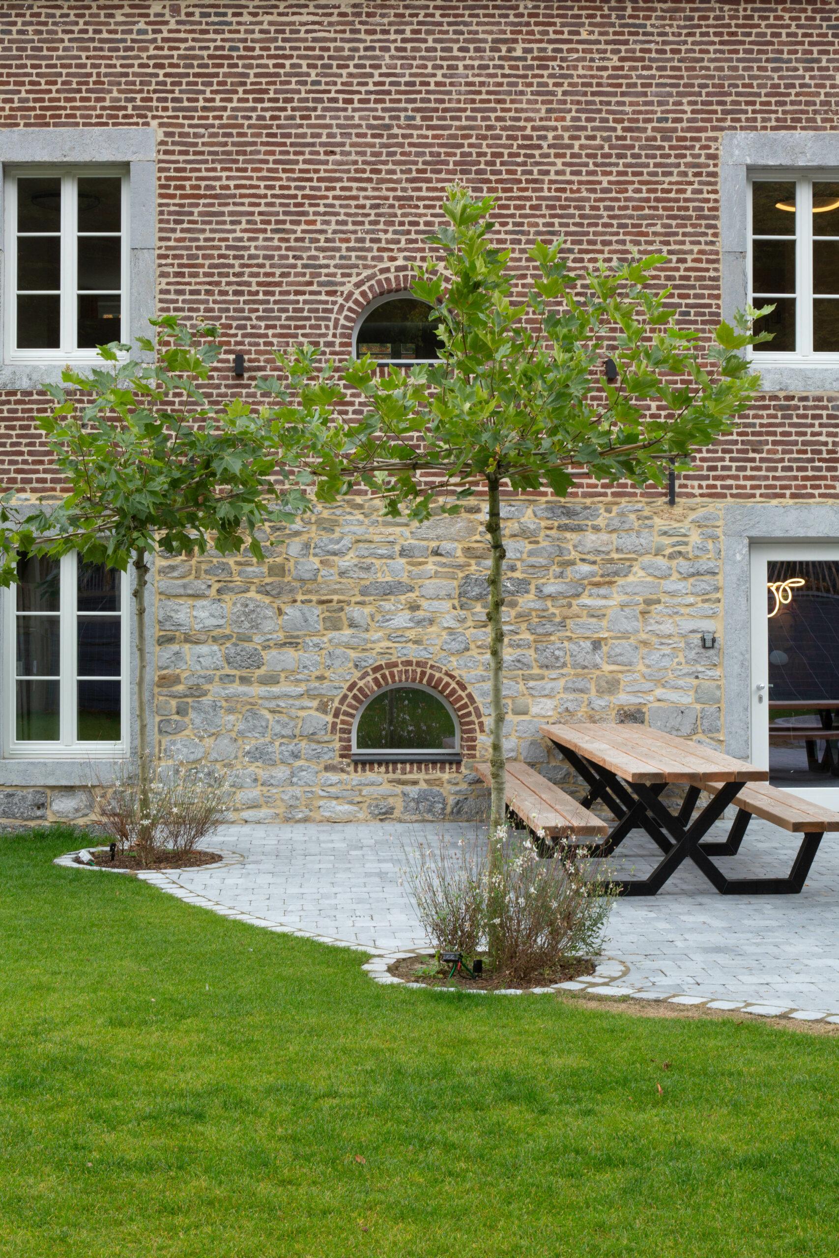 Les bâtiments extérieurs, témoins de l’histoire du site et de son ancrage territorial, ont été intégralement conservés. Leur volumétrie, leurs façades et leurs caractéristiques architecturales ont été préservées, afin de maintenir la mémoire des lieux et de respecter le caractère authentique de l’ensemble. Cette conservation s’accompagne d’un travail de mise en valeur soigné, notamment par le traitement qualitatif des abords, la réorganisation des circulations et l’intégration paysagère. À l’intérieur, les espaces ont été entièrement repensés pour répondre aux exigences actuelles de confort, de fonctionnalité et d’accueil d’un public nombreux, tout en dialoguant avec l’enveloppe existante. Le réaménagement intérieur conjugue sobriété, qualité des matériaux et luminosité, afin d’offrir une expérience chaleureuse et durable.