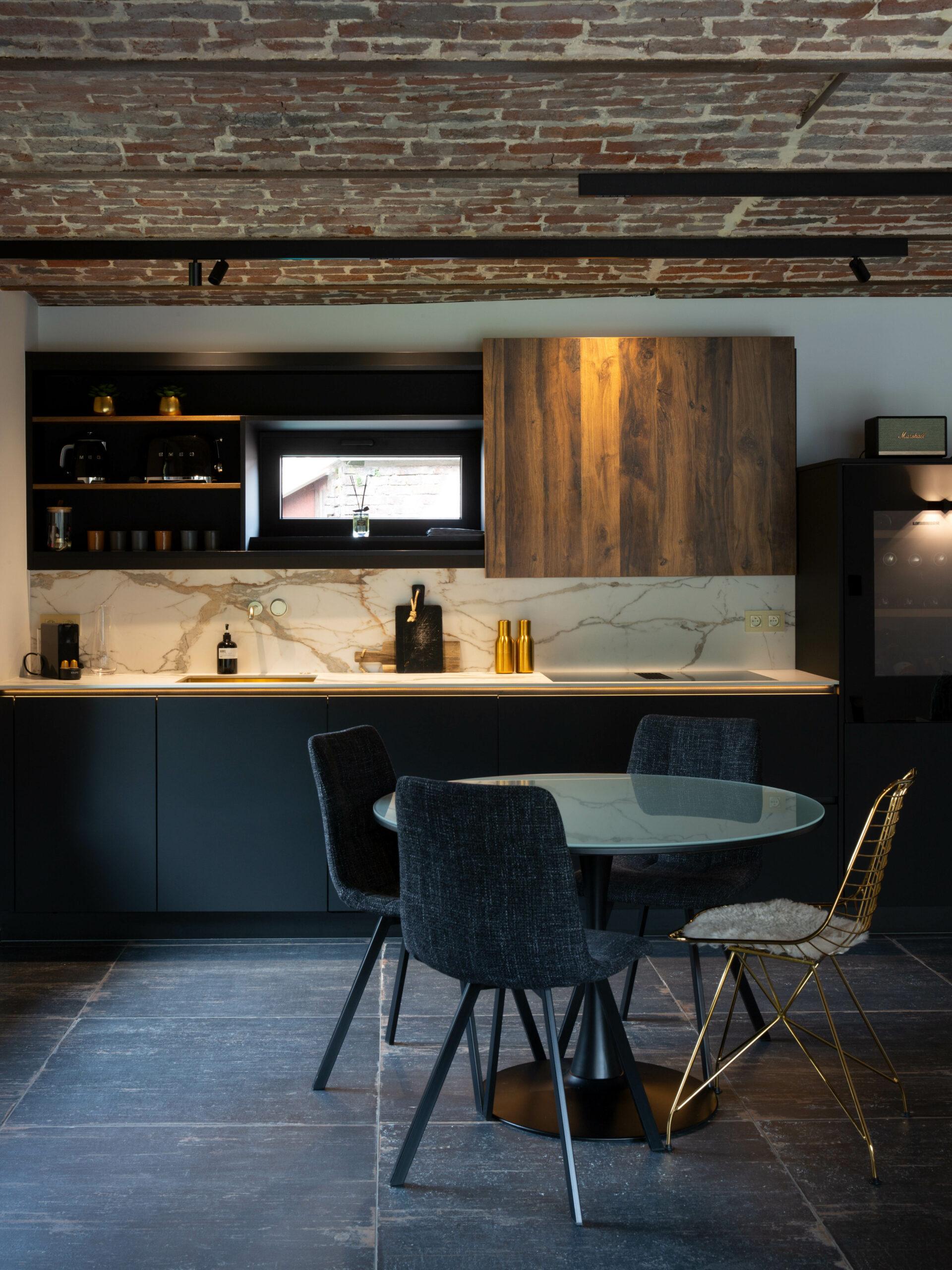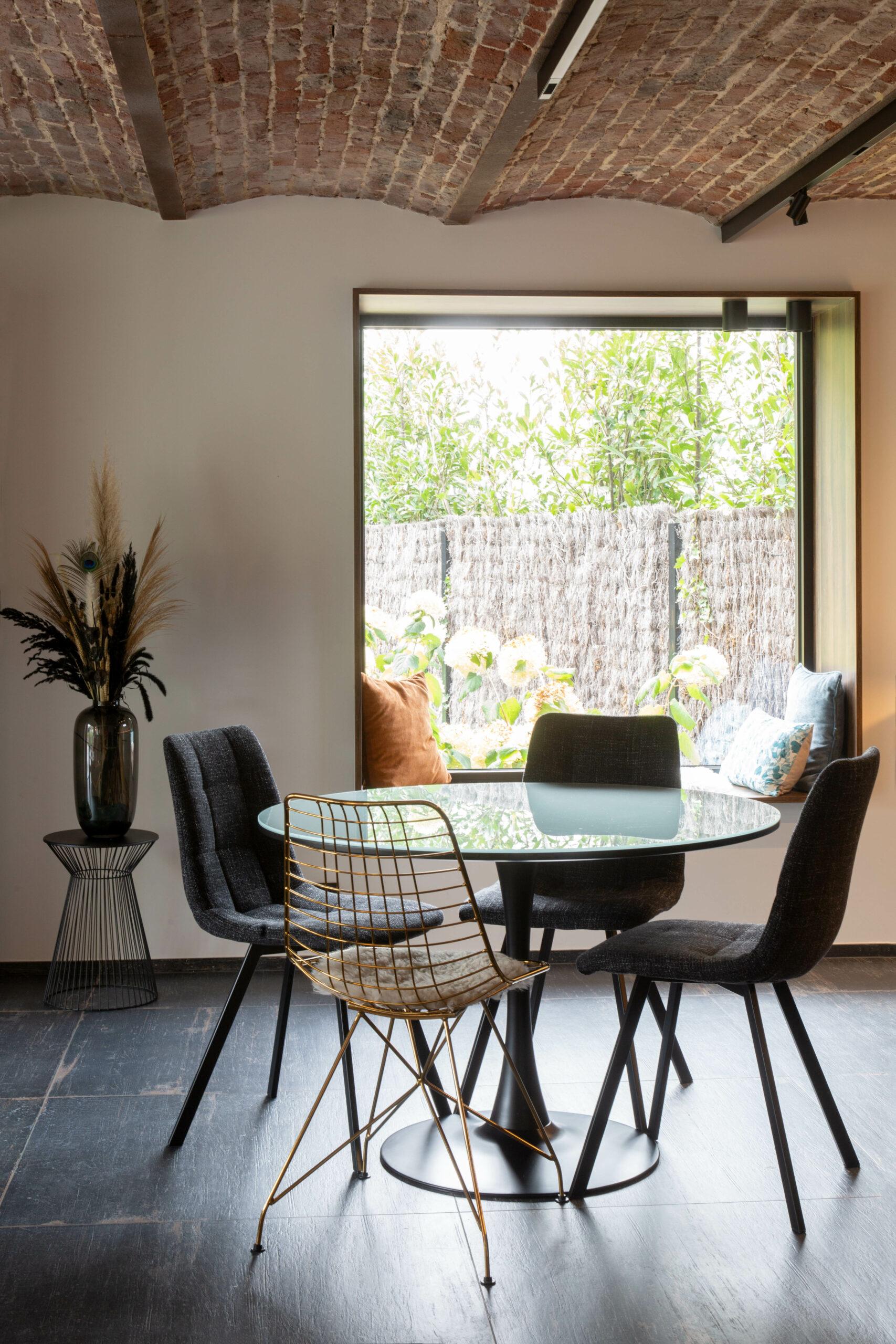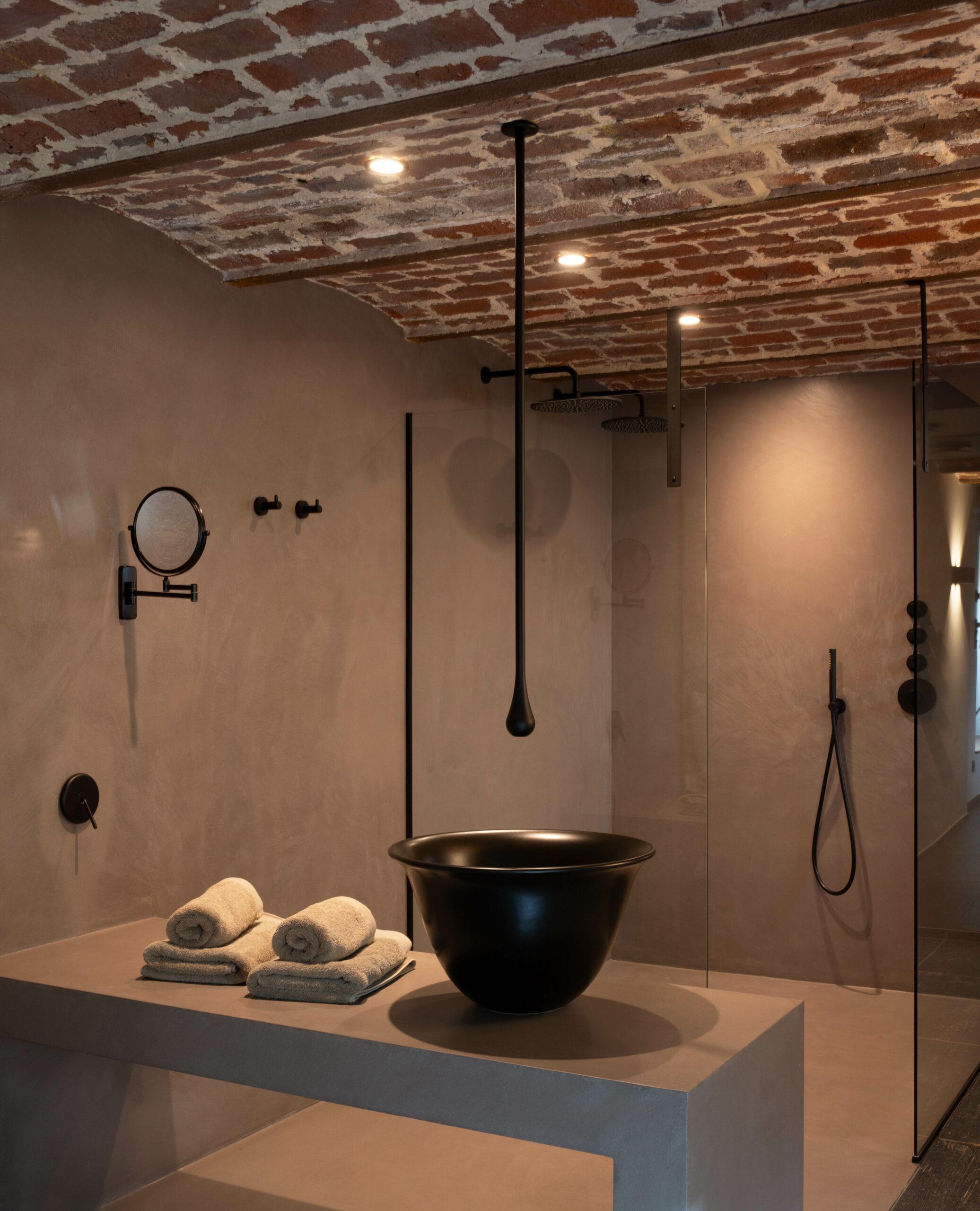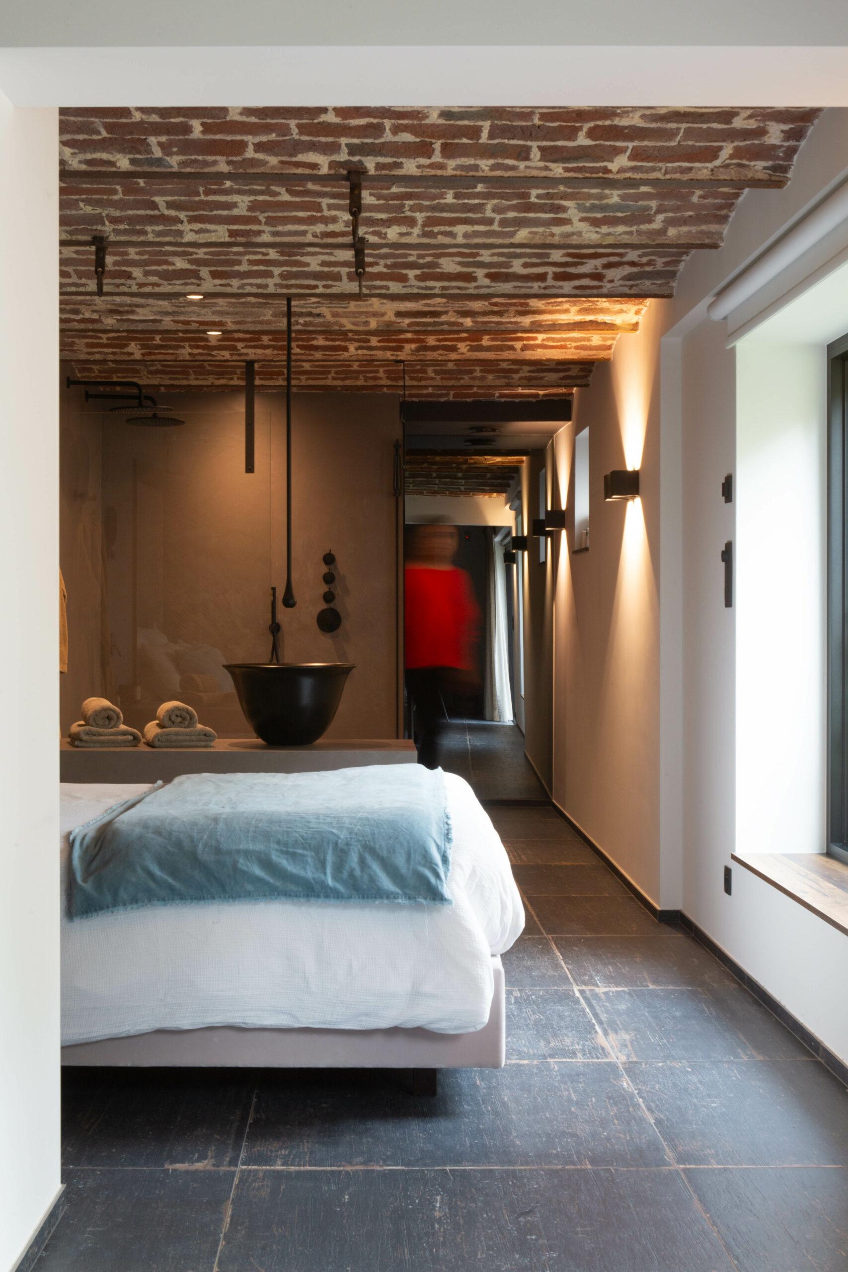 Le premier logement situé au rez-de-chaussée, bénéficie d'une relation directe avec l'extérieur. De larges baies vitrées apportent lumière et vues dégagées sur les espaces verts. Les anciennes voussettes en briques, soigneusement conservées, créent une ambiance chaleureuse et authentique. La salle de bain, ouverte sur la chambre, renforce cette atmosphère brute et intime, accentuée par le choix de matériaux naturels et sobres, qui soulignent l'esprit du lieu.