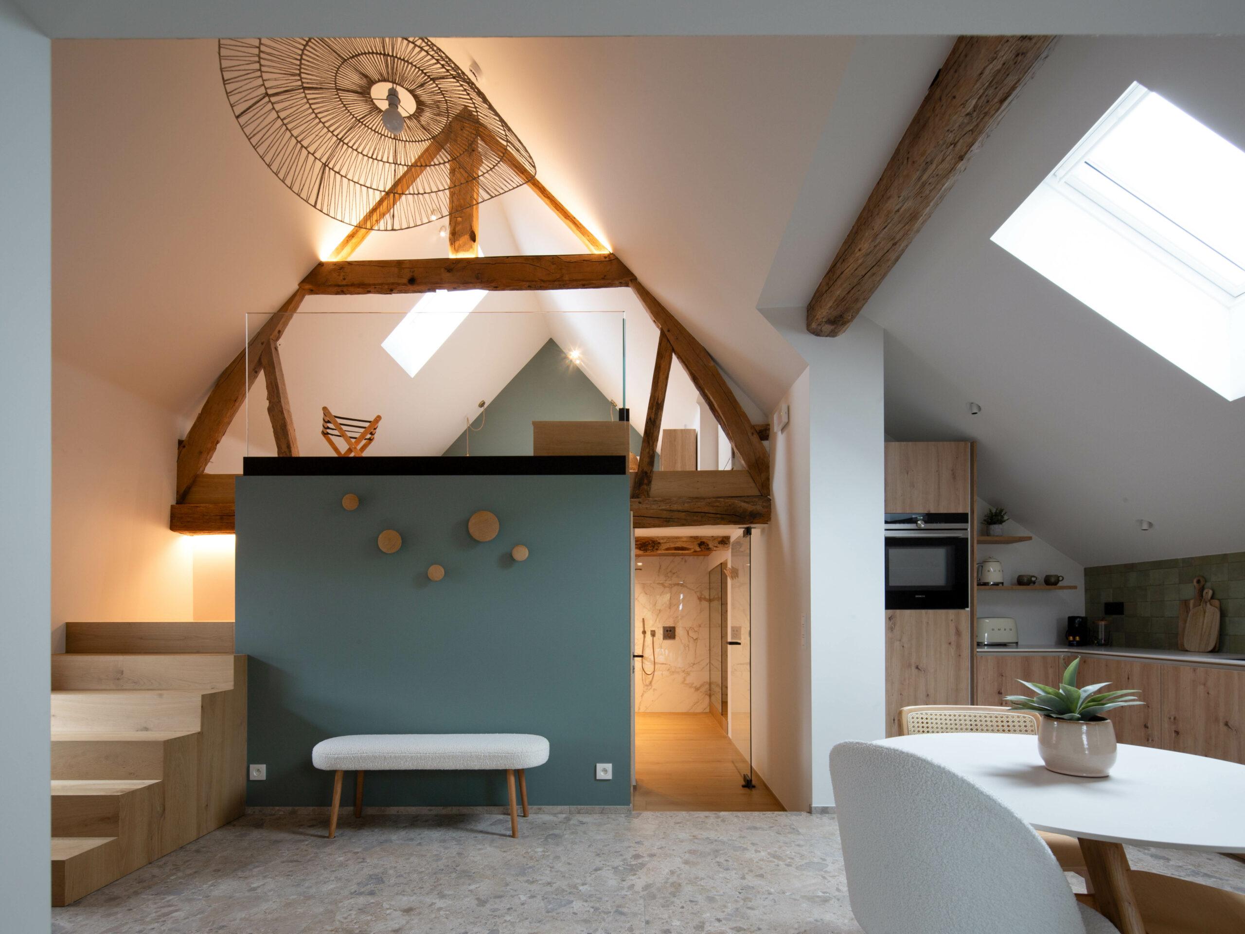 Le second logement, situé à l'étage, a été pensé comme un véritable cocon. Celui-ci profite d'une double hauteur dans l'espace repas, qui permet de mettre en valeur la charpente d'origine. La chambre ouverte crée une connexion verticale originale, tandis qu'un balcon métallique prolonge le séjour vers le paysage.