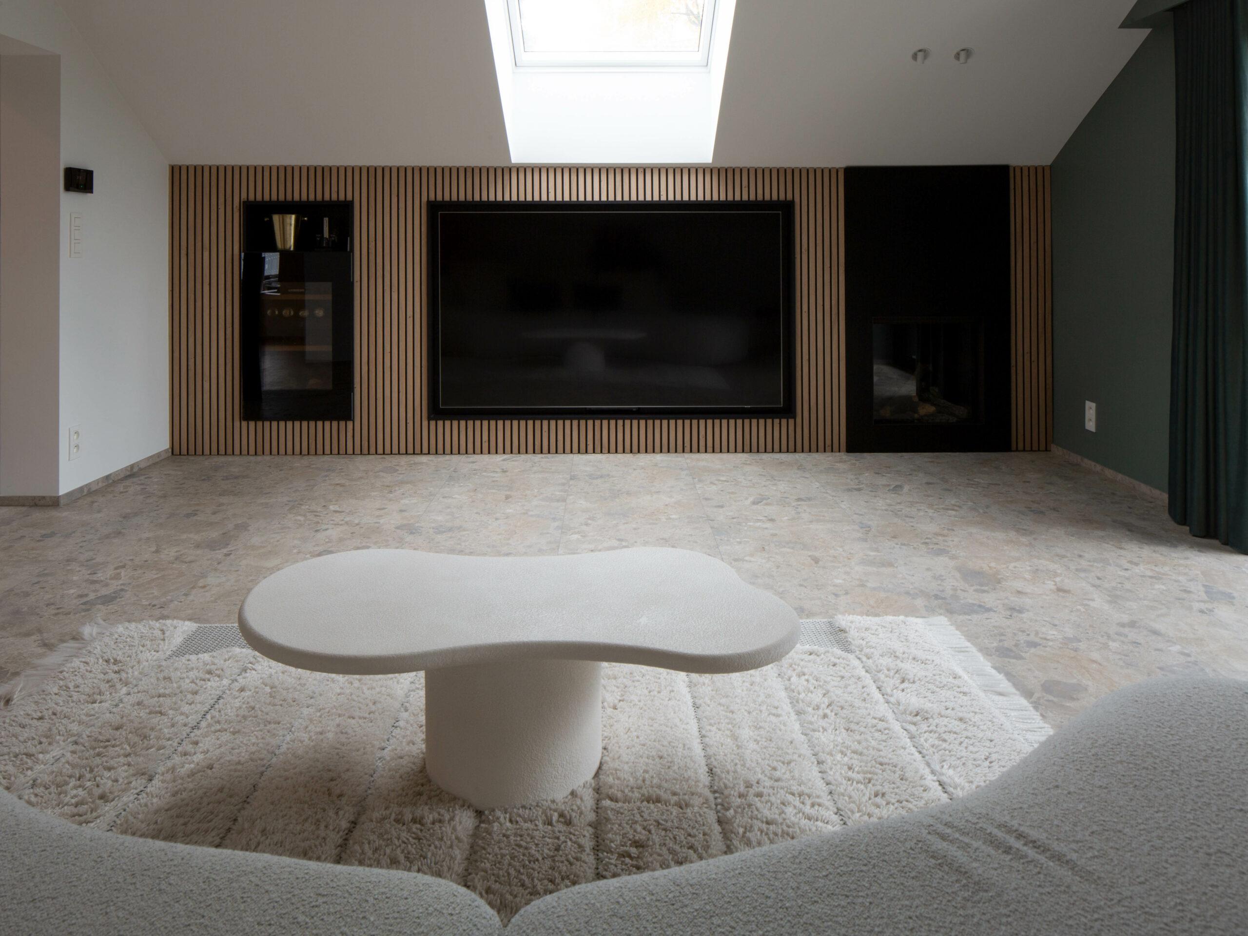 Les teintes claires, associées à un habillage bois intégrant un poêle et la TV, apportent à l'ensemble une ambiance douce et contemporaine, idéale pour un séjour reposant.