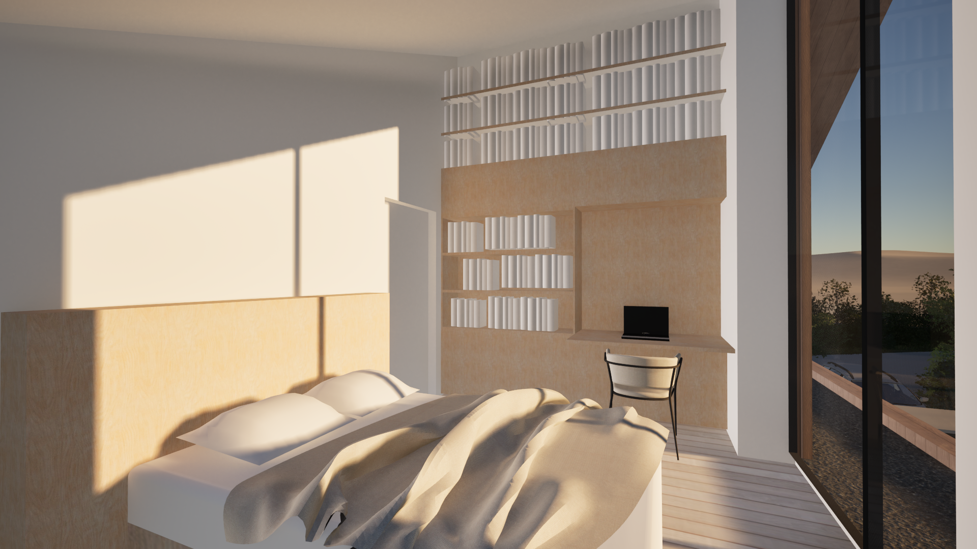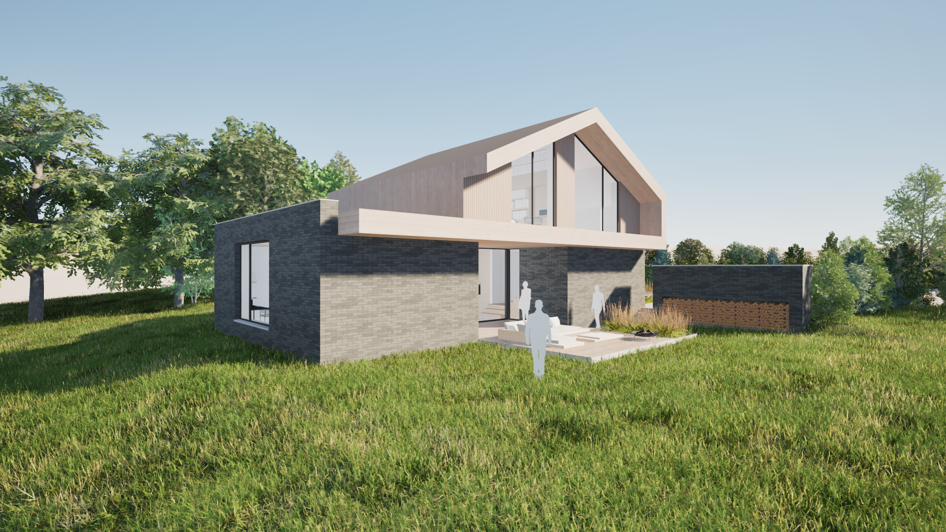Une terrasse semi-rentrante connecte les espaces de vie aux extérieurs, tandis que de larges baies vitrées s’ouvrent sur le paysage champêtre, créant de belles perspectives visuelles sur la nature environnante.